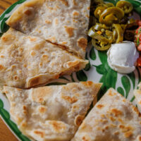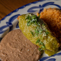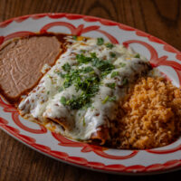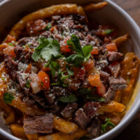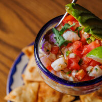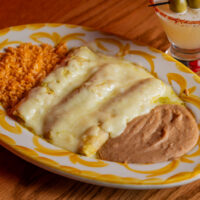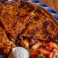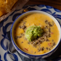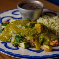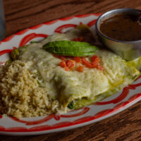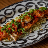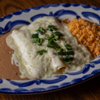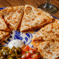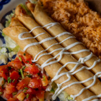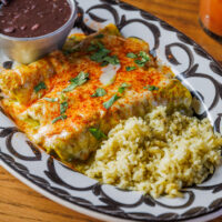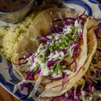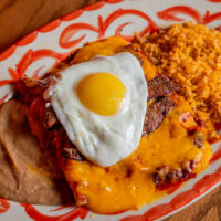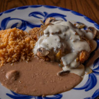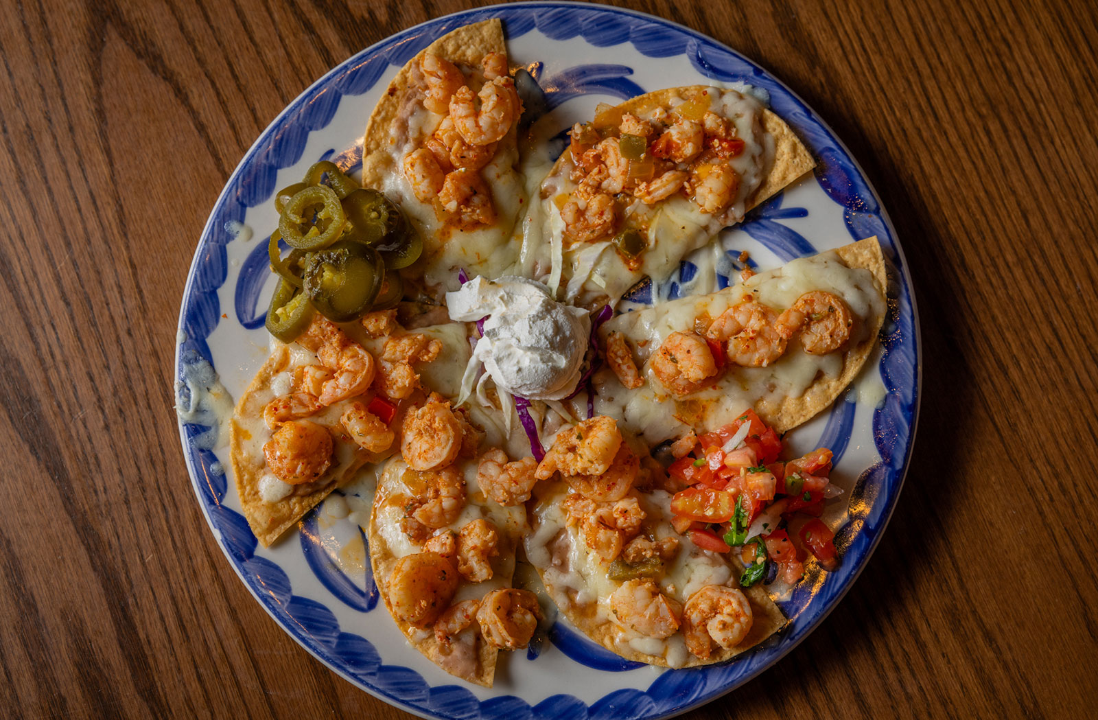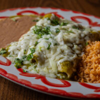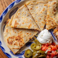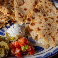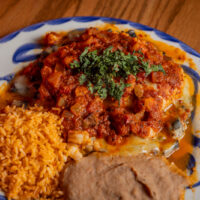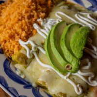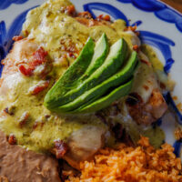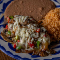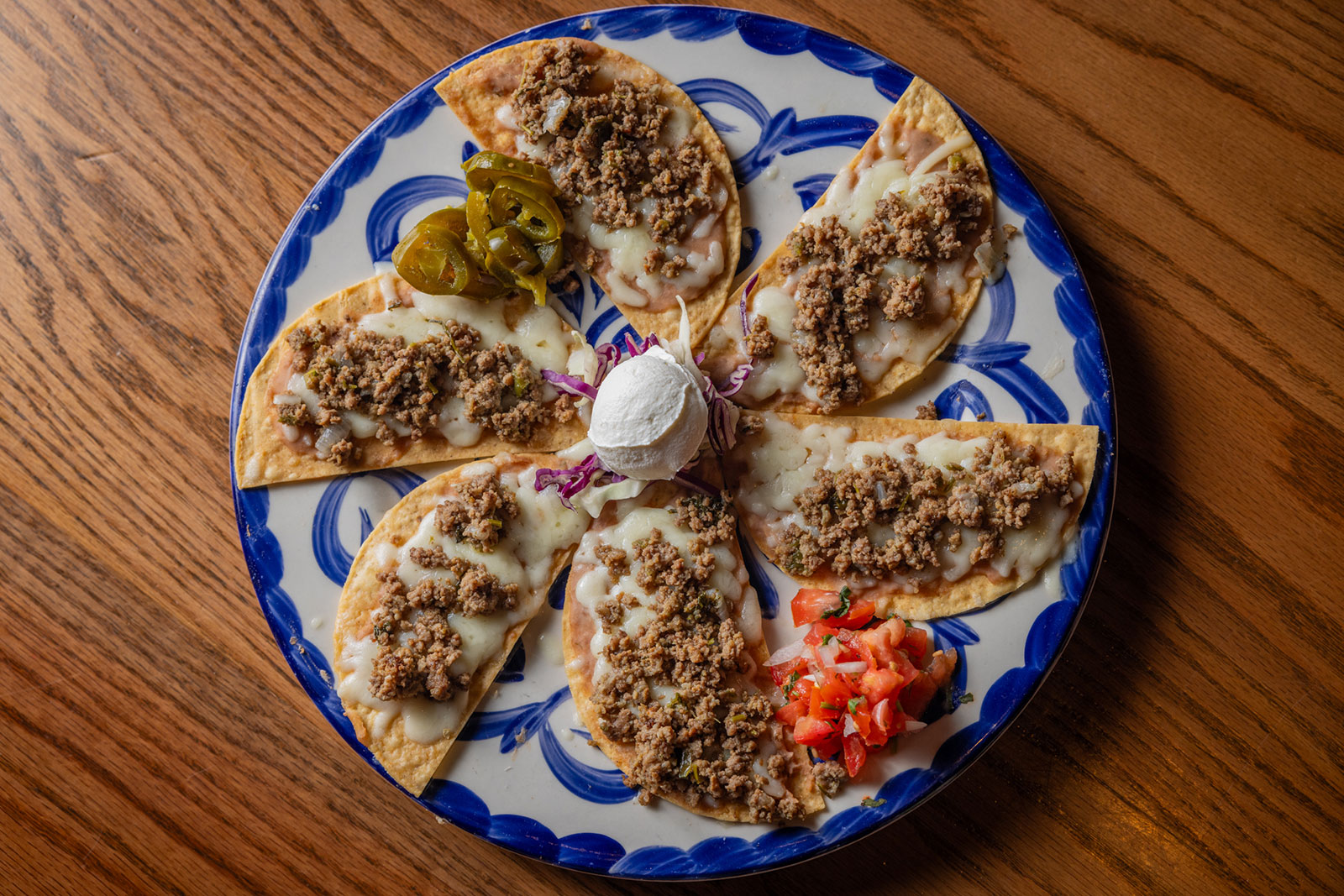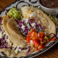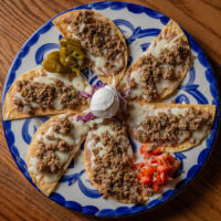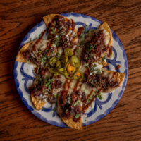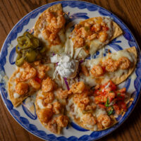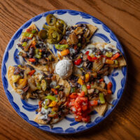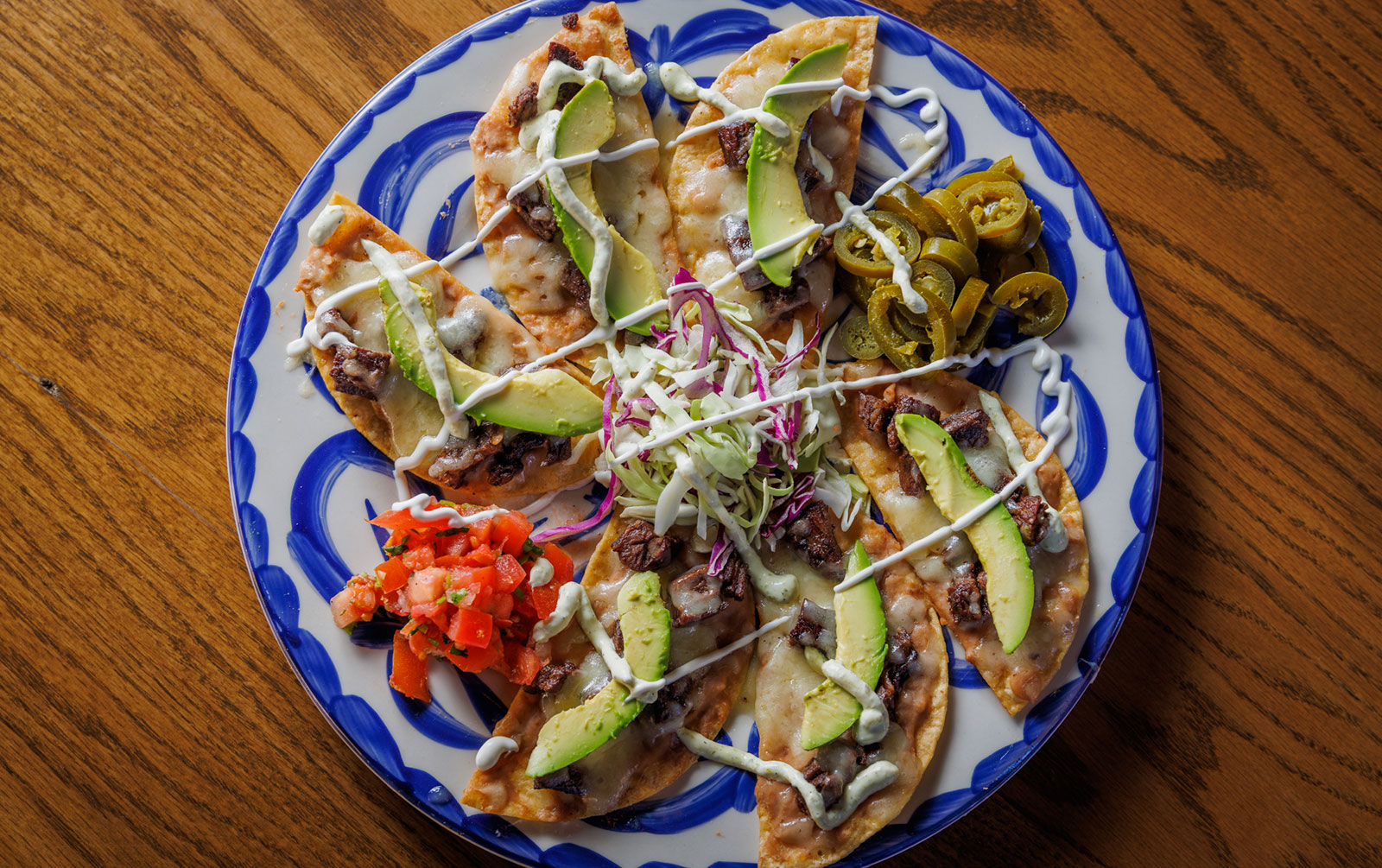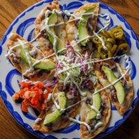 Six crispy corn tortilla halves topped with Chicken fajitas, refried beans, jack cheese, sliced avocado, and pico de gallo. Drizzled with sour cream and jalapeño crema. Served with cabbage slaw, sour cream, pico de gallo, and pickled jalapeños.