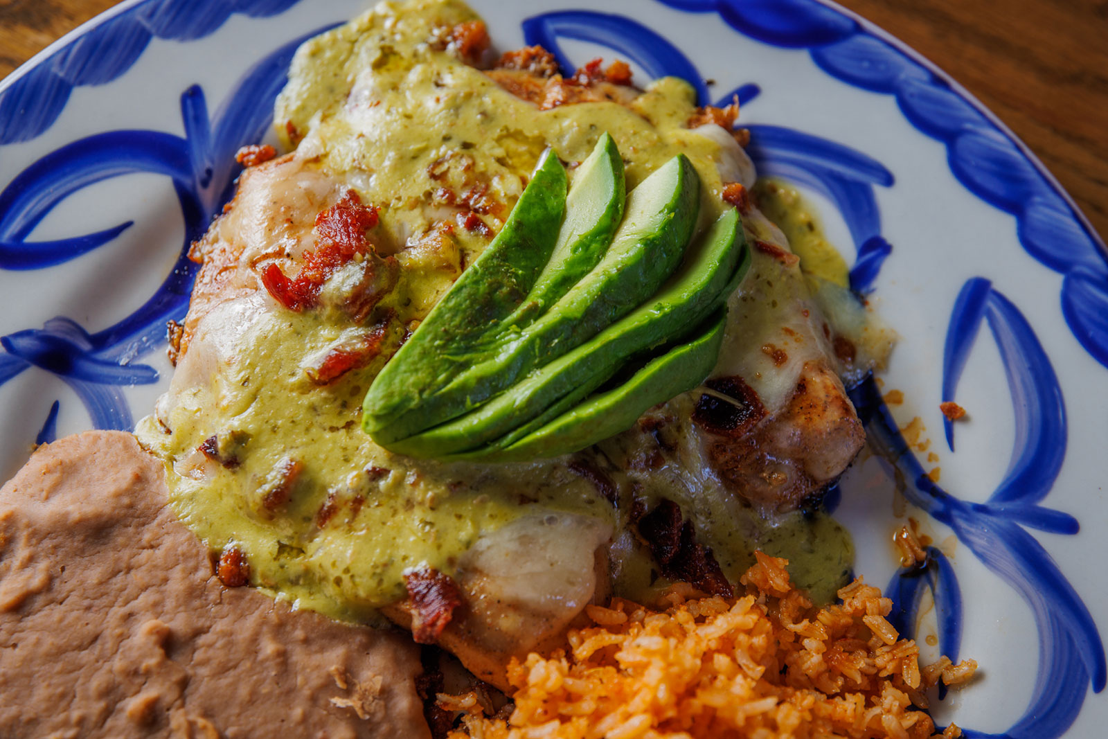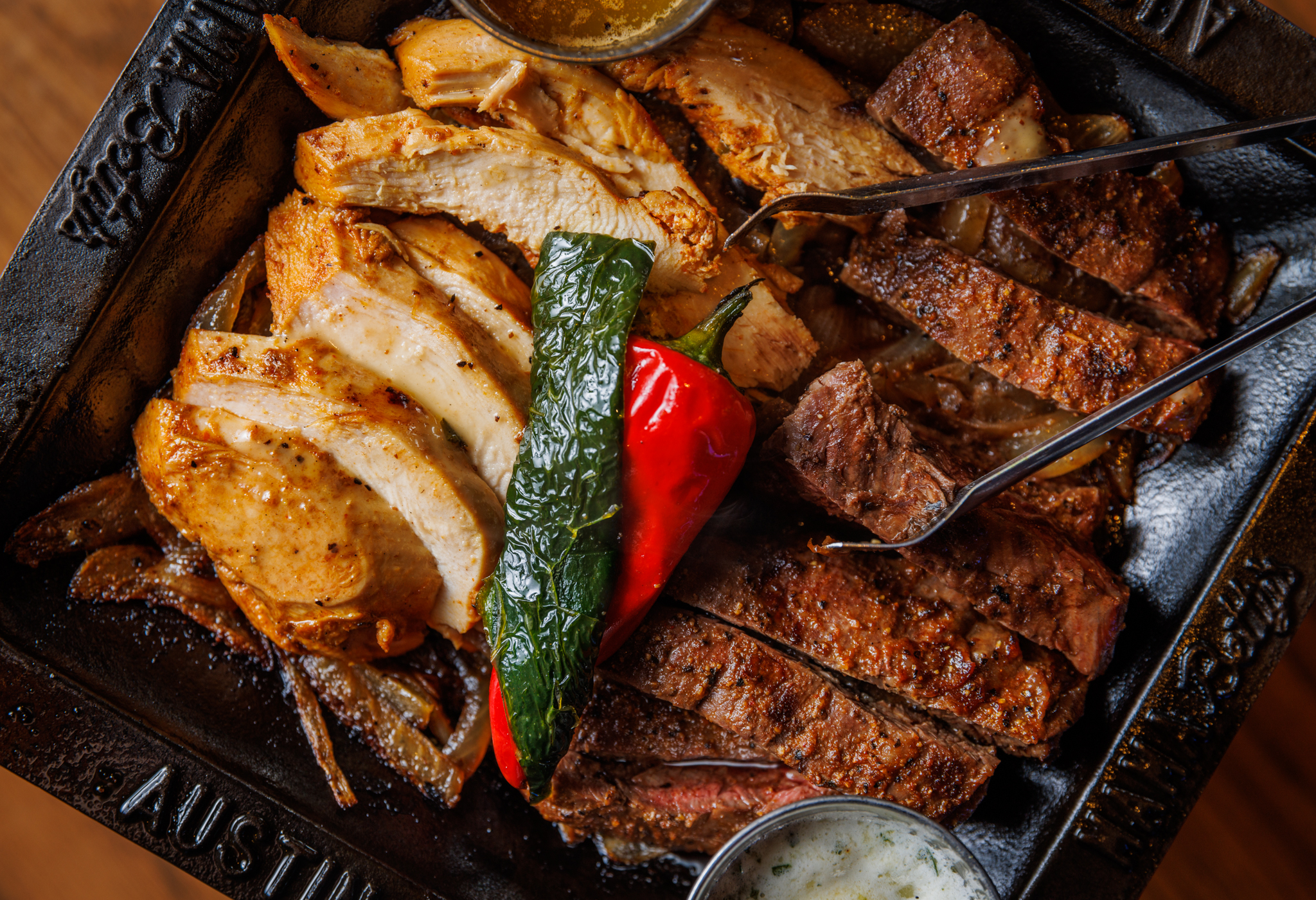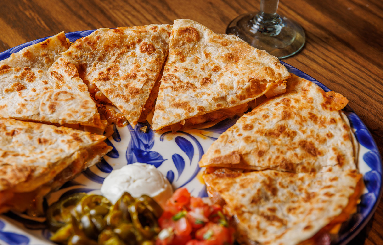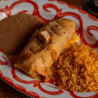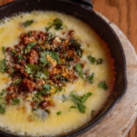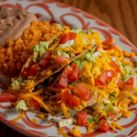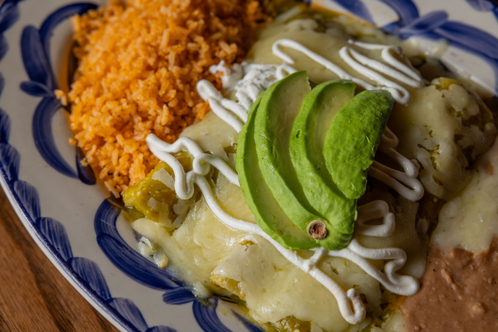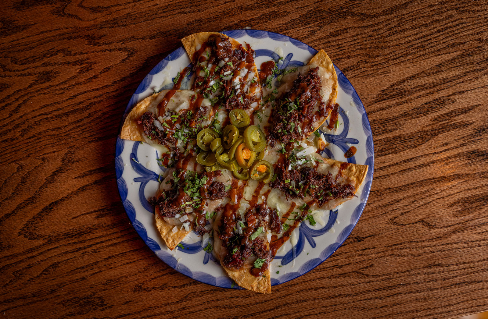 Six crispy corn tortilla halves topped with Chicken fajitas, refried beans, jack cheese, sliced avocado, and pico de gallo. Drizzled with sour cream and jalapeño crema. Served with cabbage slaw, sour cream, pico de gallo, and pickled jalapeños.