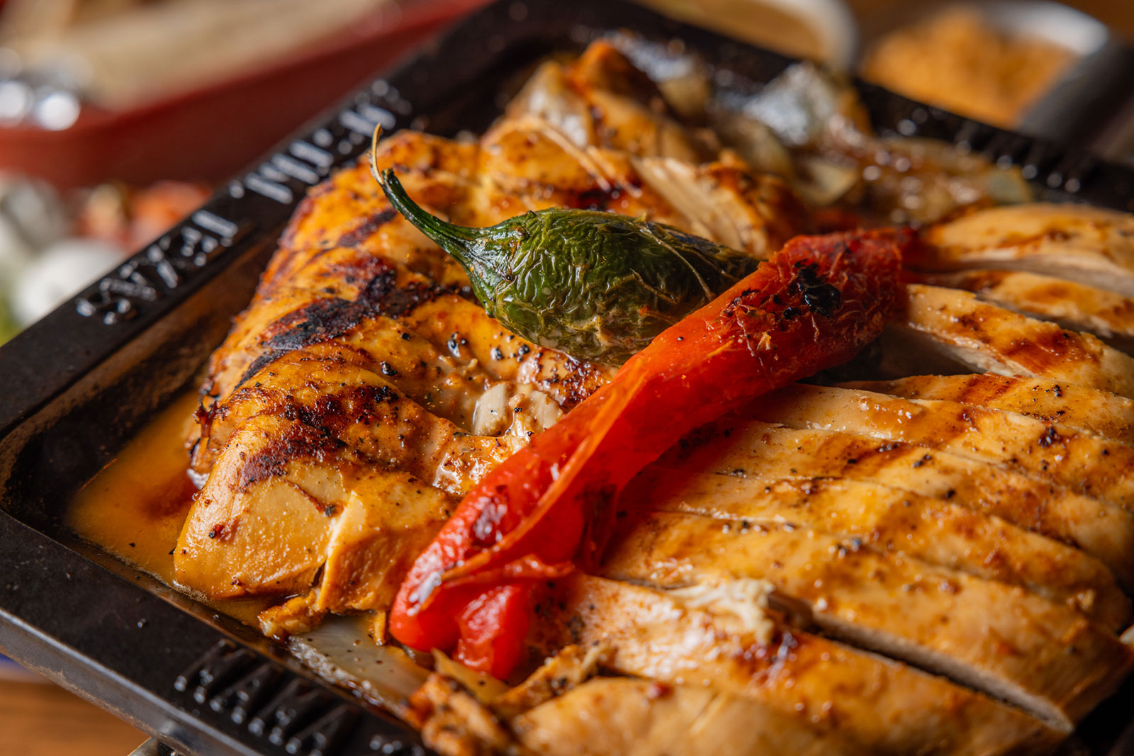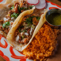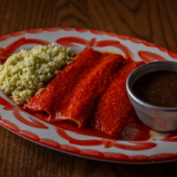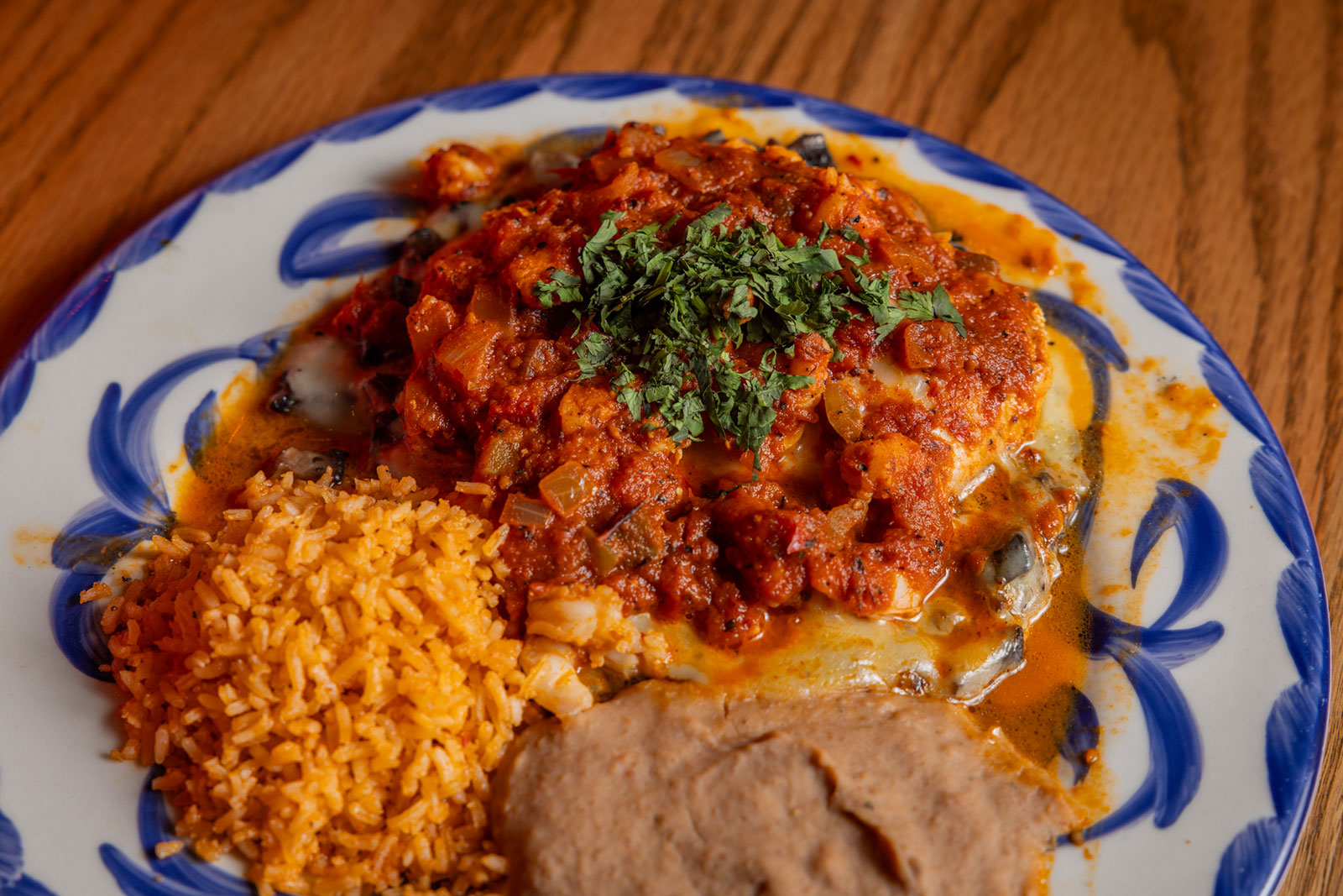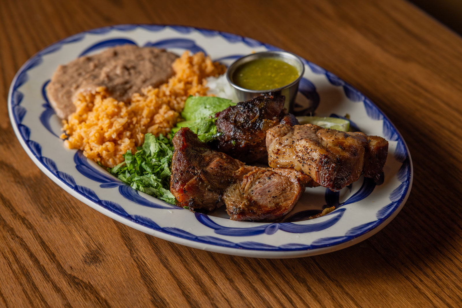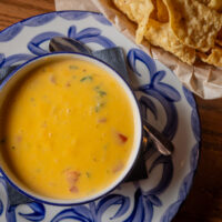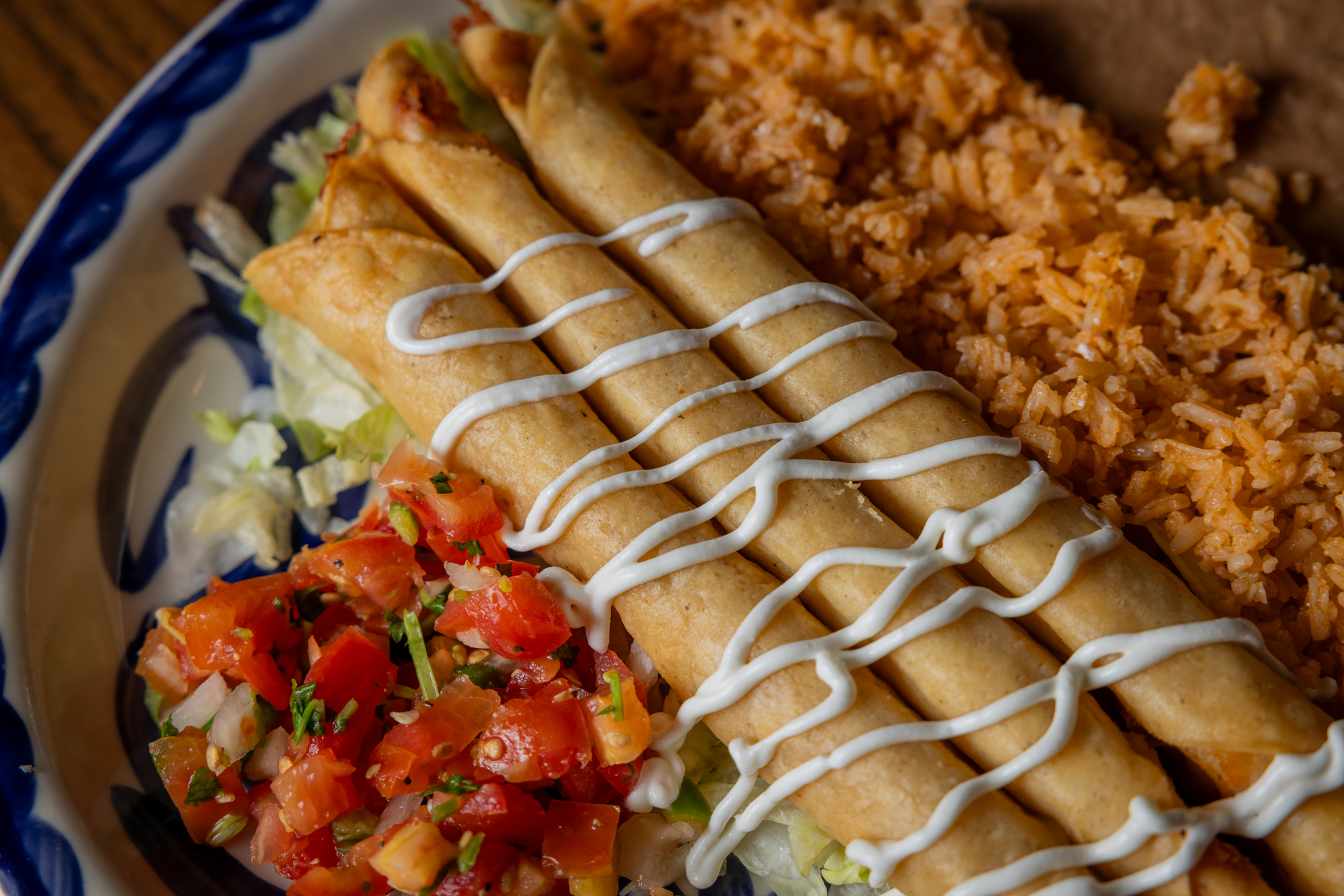 Six crispy corn tortilla halves topped with Chicken fajitas, refried beans, jack cheese, sliced avocado, and pico de gallo. Drizzled with sour cream and jalapeño crema. Served with cabbage slaw, sour cream, pico de gallo, and pickled jalapeños.