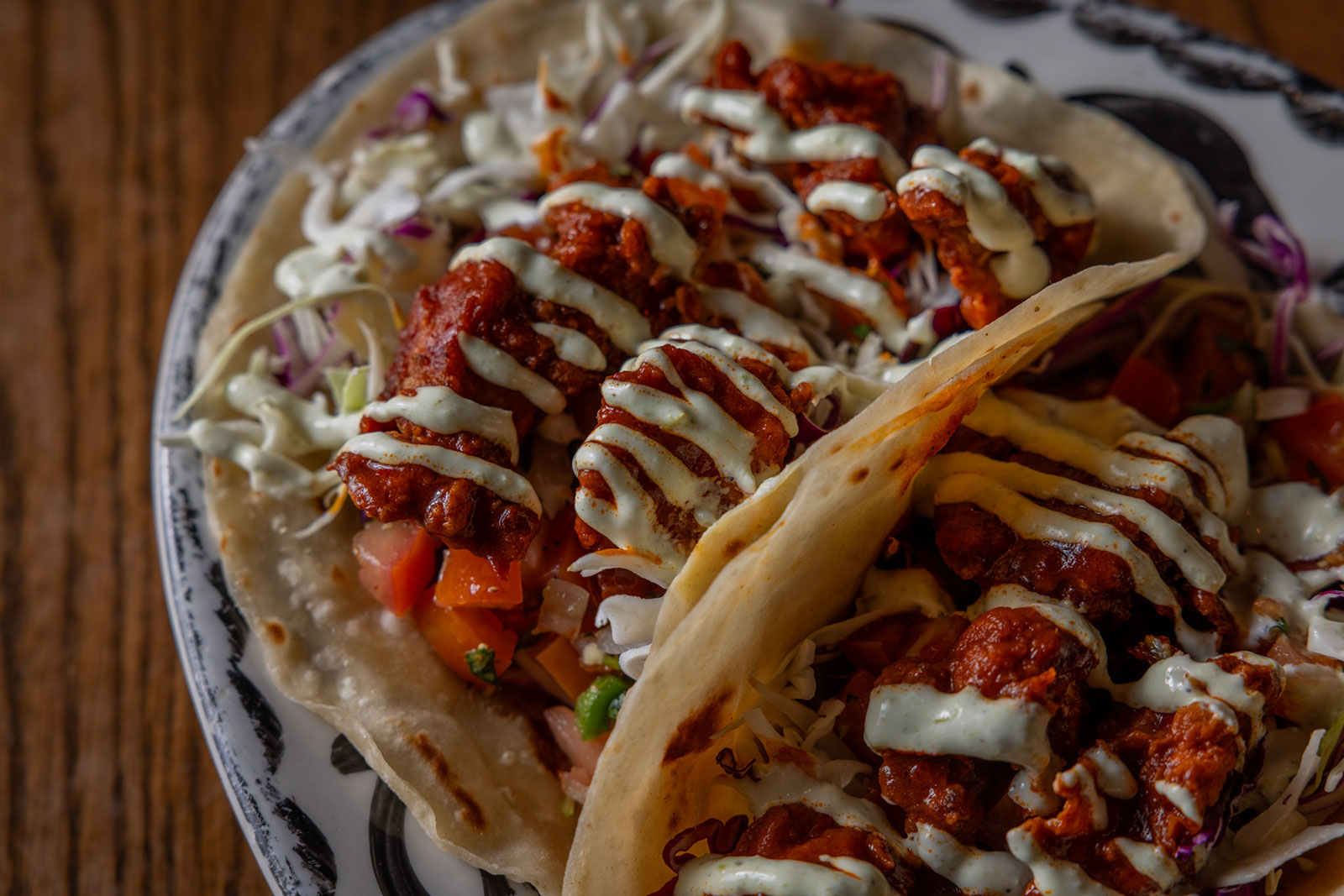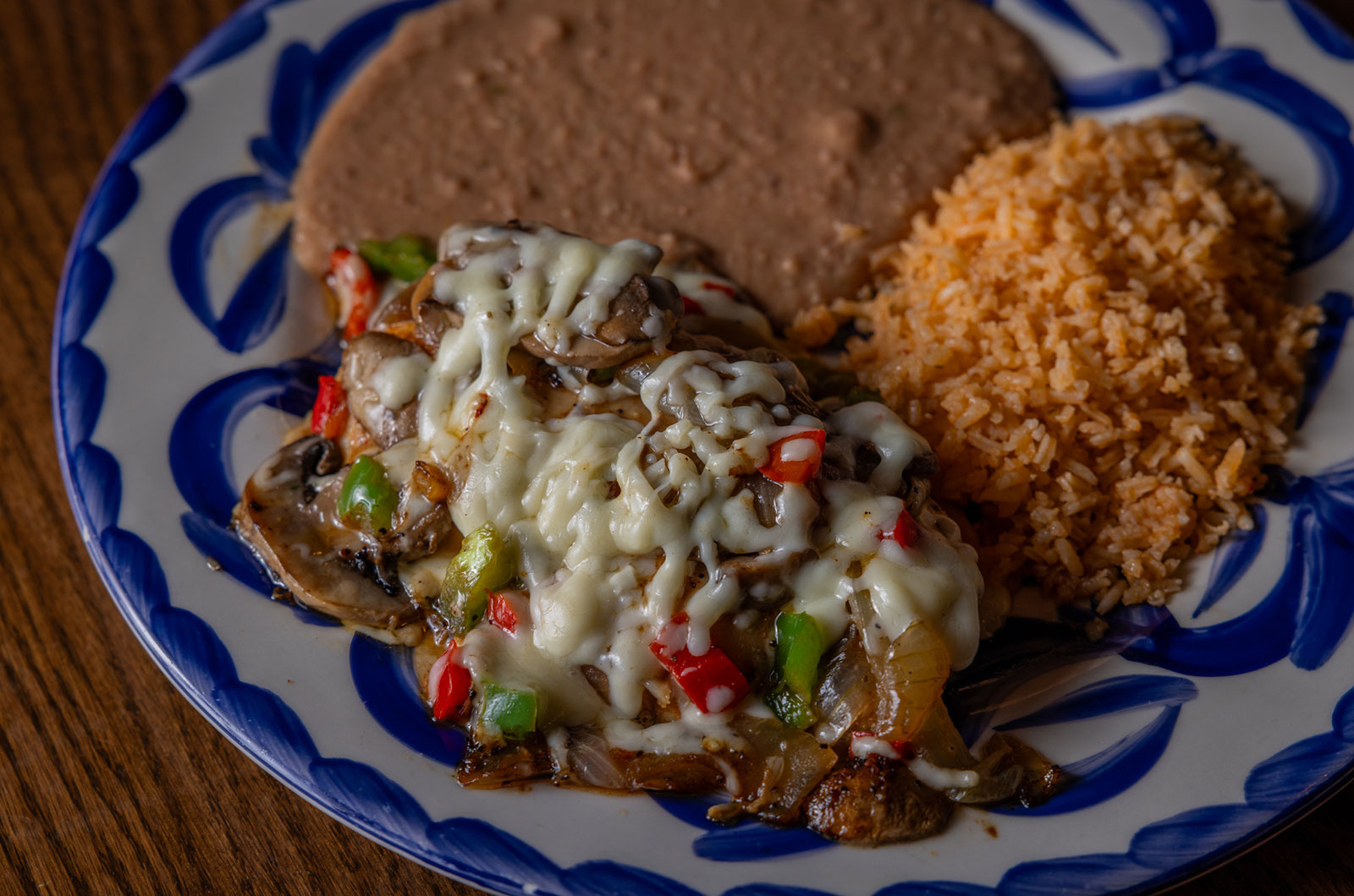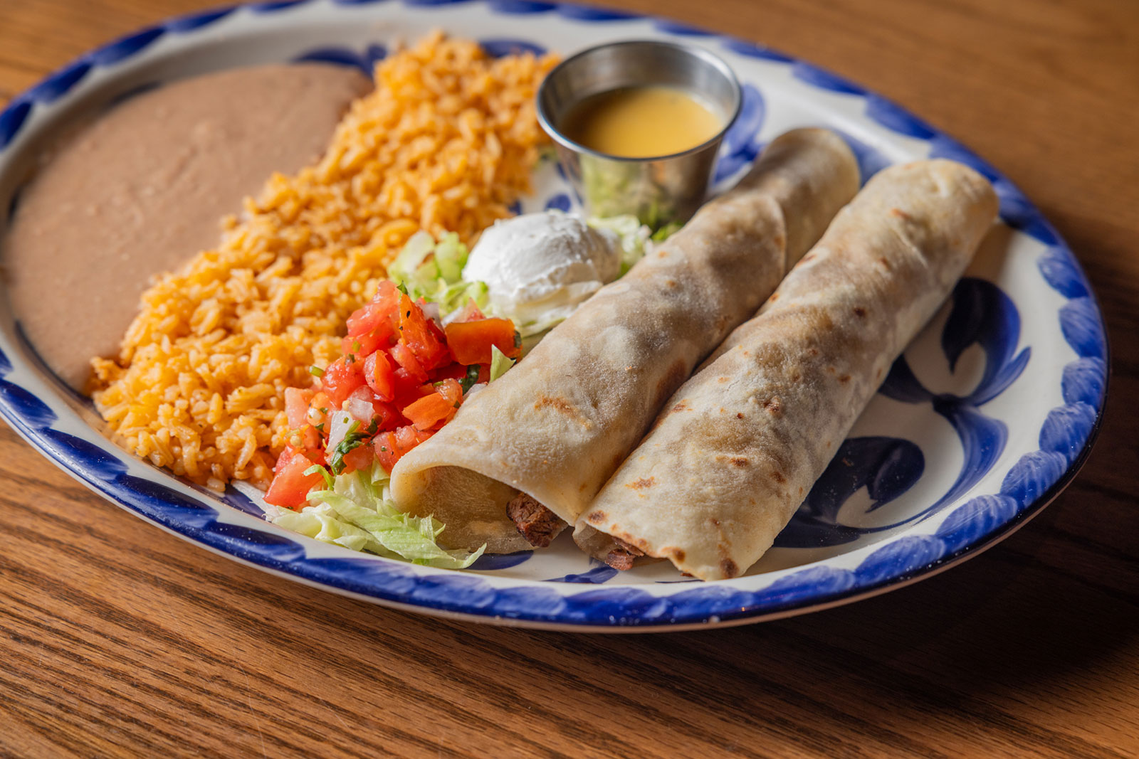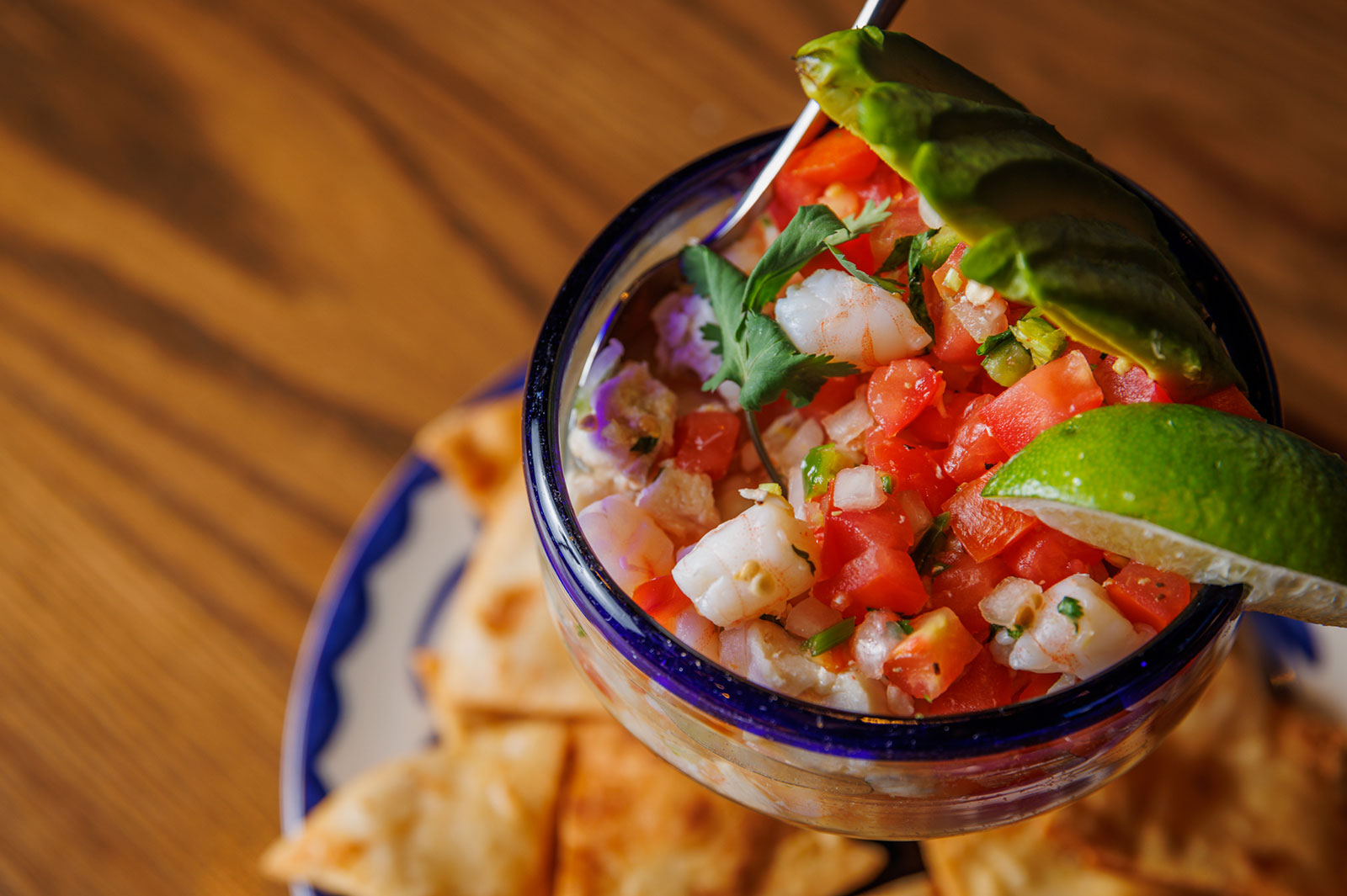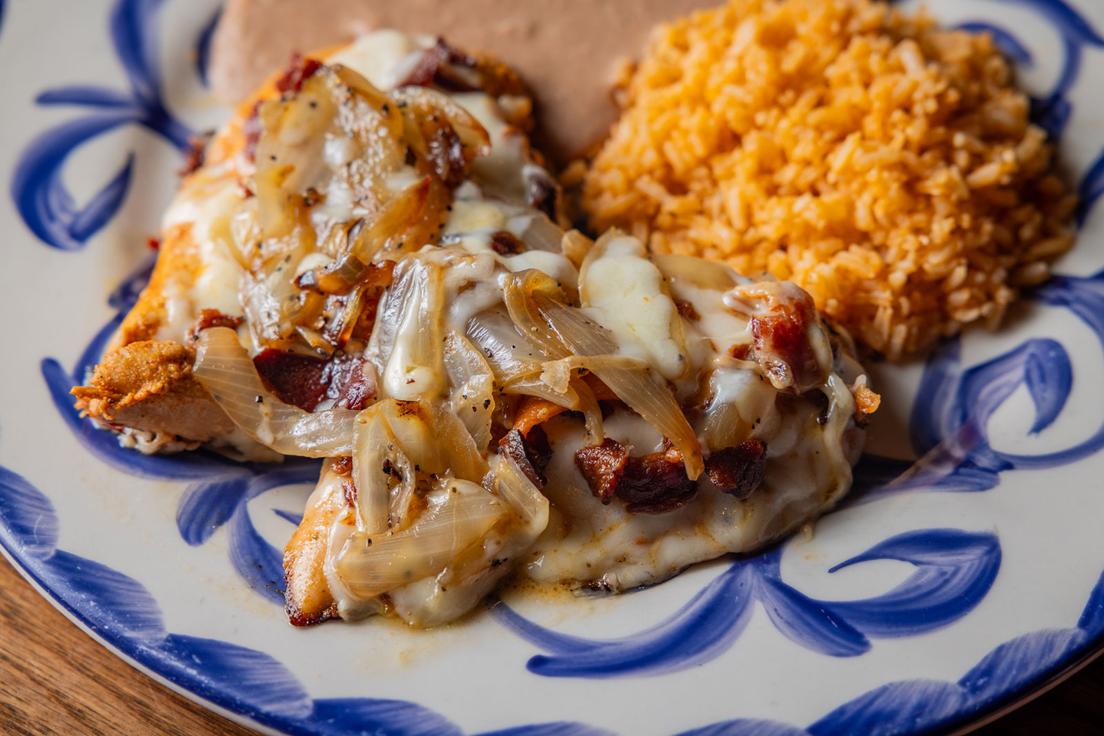 Six crispy corn tortilla halves topped with Chicken fajitas, refried beans, jack cheese, sliced avocado, and pico de gallo. Drizzled with sour cream and jalapeño crema. Served with cabbage slaw, sour cream, pico de gallo, and pickled jalapeños.