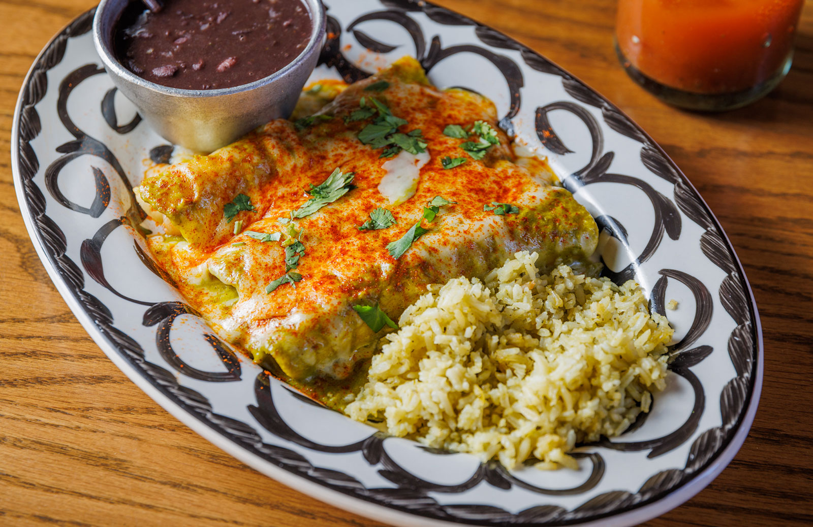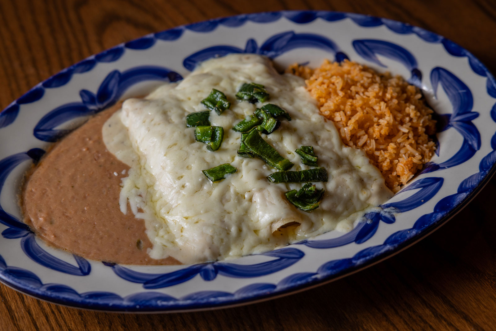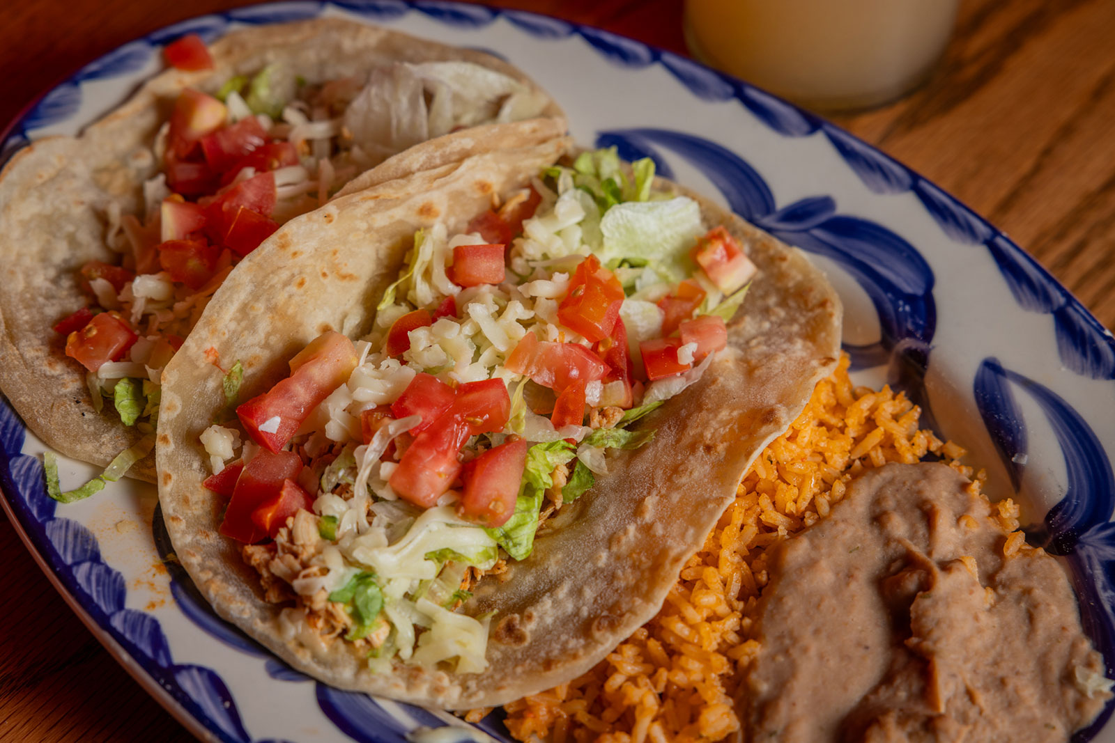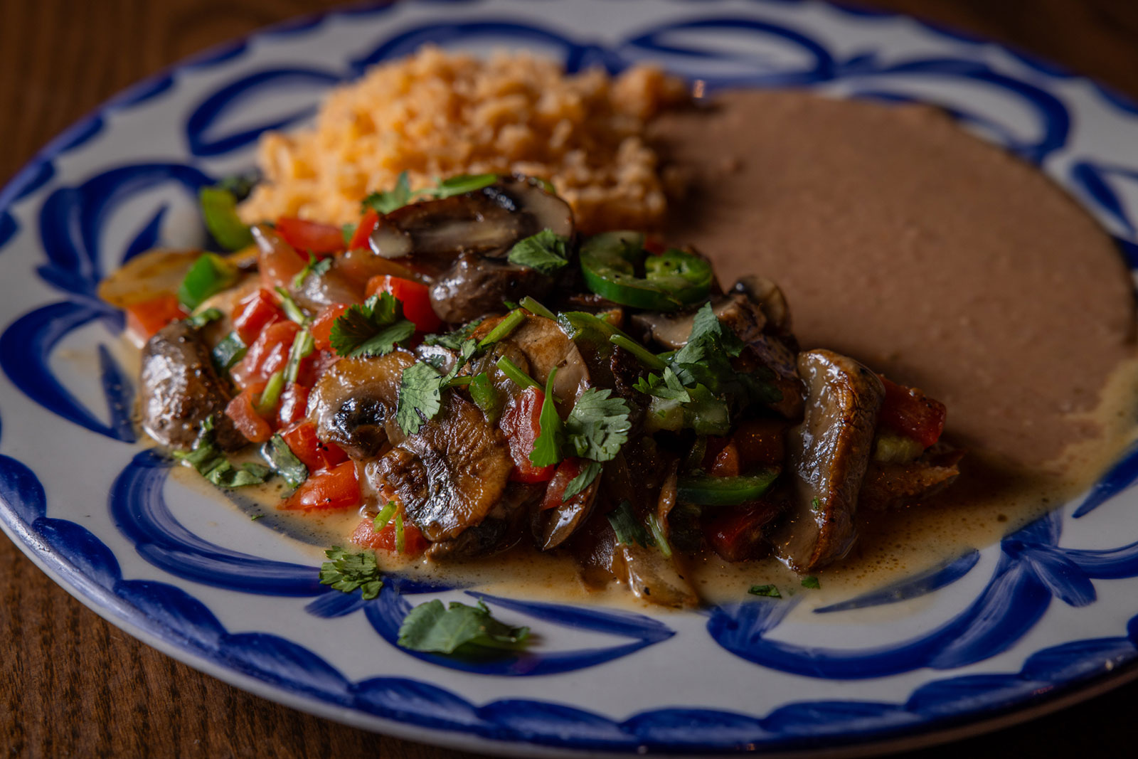 Six crispy corn tortilla halves topped with Chicken fajitas, refried beans, jack cheese, sliced avocado, and pico de gallo. Drizzled with sour cream and jalapeño crema. Served with cabbage slaw, sour cream, pico de gallo, and pickled jalapeños.