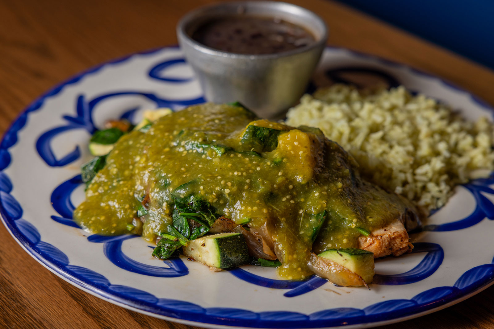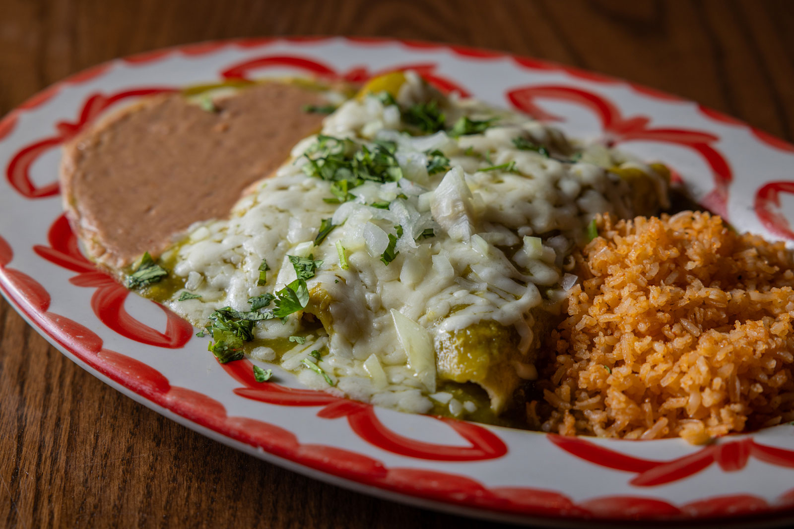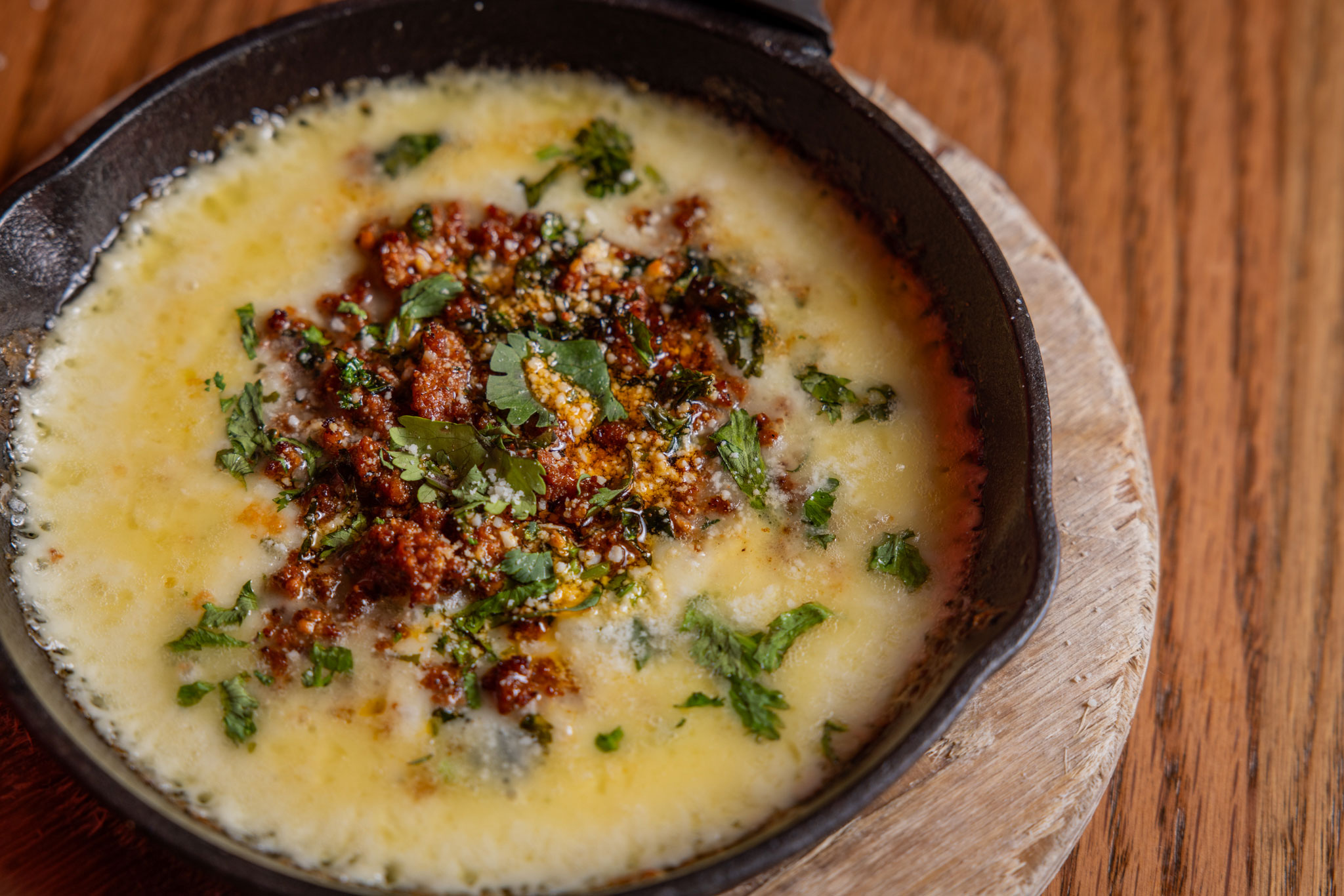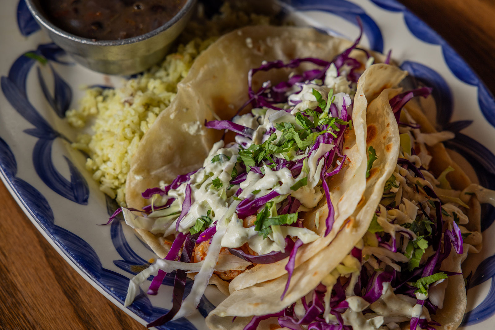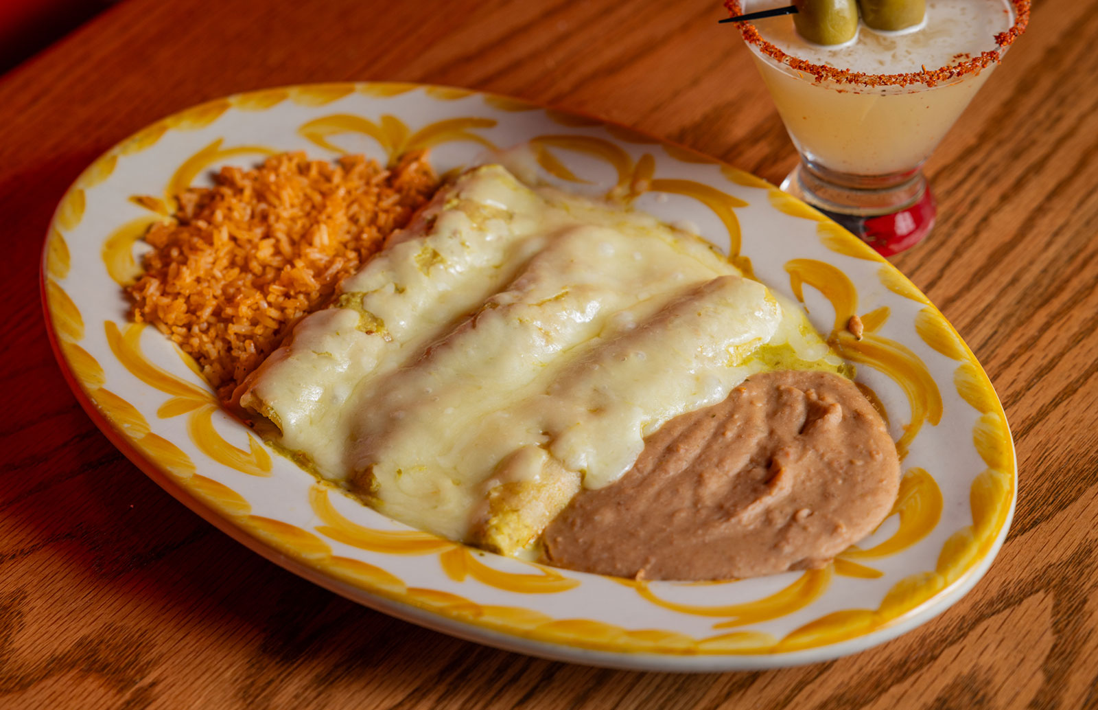 Six crispy corn tortilla halves topped with Chicken fajitas, refried beans, jack cheese, sliced avocado, and pico de gallo. Drizzled with sour cream and jalapeño crema. Served with cabbage slaw, sour cream, pico de gallo, and pickled jalapeños.